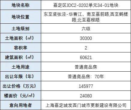 地块东至竖张泾-华曹江、南至嘉前路,西至鹤槎路,北至嘉程路,建设用地面积约3.03公顷,容积率2.0,地上计容建筑面积60621平方米,协议出让价格145977.00万元,楼面价约24080元/㎡。
