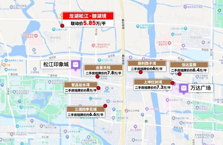 松江大学城片区,以合景天悦等为主的高端产品,二手房挂牌价高达8万/平左右,其价值上限已远超万达老商圈周边。
