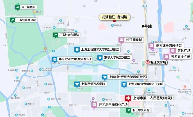 如果想通勤市区,项目南侧约900米设有松江T2有轨电车广富林路站,仅需2站既可到达9号线松江大学城站。