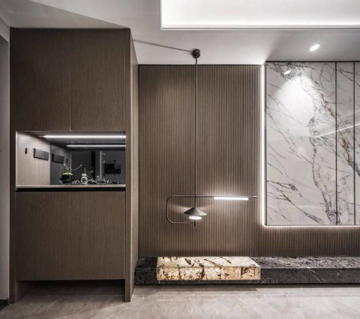 在首层归家大堂处,设置有雪山银狐陶板背景墙+普拉达绿奢石双重奢石,打造精致入户单元。