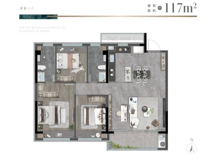 建面约117平3房2厅2卫是约100平户型的进阶版,功能布局非常相似,不同的是室内空间更加奢阔,尺度感满满。