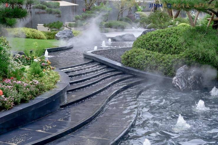 层叠而上的水台,跳跃灵动的涌泉,崇尚曲线的律动生长,普陀金茂府以高难度的工艺勾勒双曲面变化的水池压顶,营造灵动飘逸的水池形态。并通过叠瀑、跌水、涌泉的水景造境手法,让动静水面在归家动线上交替展示,融入更多不同的节奏,使观众或行或停,享受惬意。