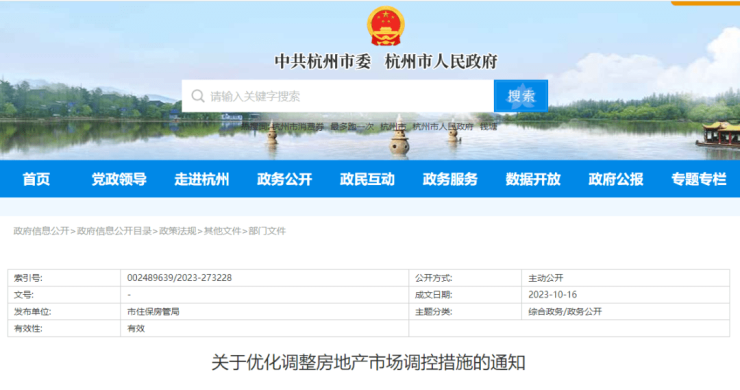 据杭州市住房保障和房产管理局官网消息,杭州市房地产市场平稳健康发展领导小组办公室发布《关于优化调整房地产市场调控措施的通知》。