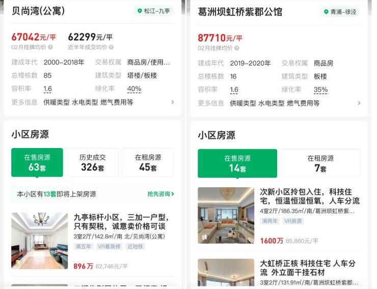 从链家网挂牌房源来看,贝尚湾北侧约2公里的葛洲坝虹桥紫郡公馆,二手房挂牌均价约8.7万元/平方米;贝尚湾本小区最新挂牌均价超6.7万元/平方米,近半年成交均价约6.3万/平方米。