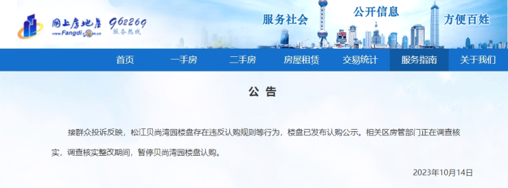 2023年10月14日,网上房地产发出公告:接群众投诉反映,松江贝尚湾园楼盘存在违反认购规则等行为,相关区房管部门正在调查核实,调查核实整改期间,暂停贝尚湾园楼盘认购。官方下场、发布“暂停认购”公告的案例近年来很是罕见。