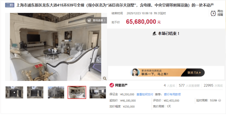 据阿里资产消息,汤臣高尔夫别墅一套建面约435.87㎡法拍房源,二拍上架,最终以6568万元成交,折合单价15.07万元/㎡。
