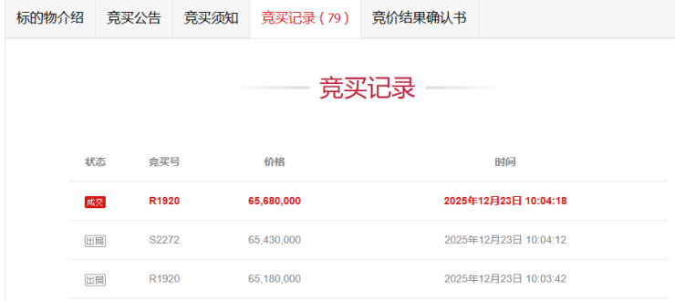 二拍上架后,吸引了4人报名,在经过79轮竞价后,以6568万元成交,折合单价15.07万元/㎡。