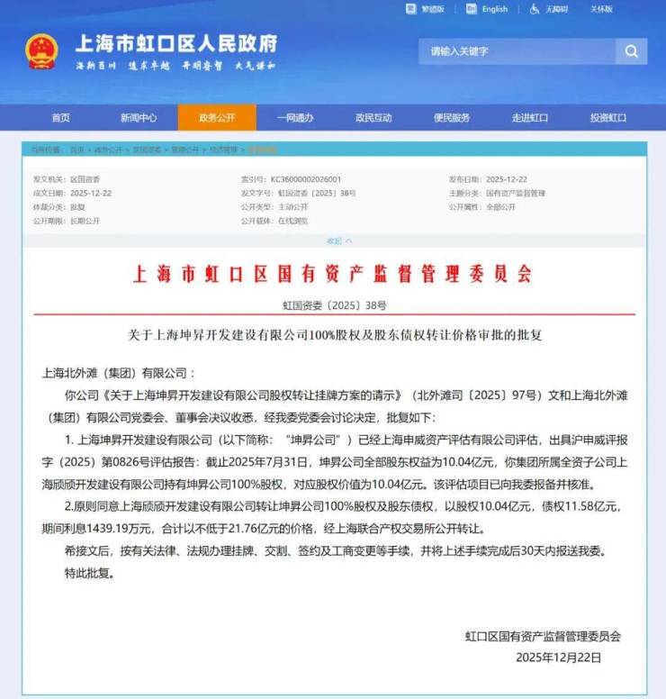 值得一提的是,去年12月,虹口区人民政府网站已经发布了《关于上海坤昇开发建设有限公司100%股权及股东债权转让价格审批的批复》,原则上同意上海颀颀开发建设有限公司转让坤昇公司100%股权及股东债权,以股权10.04亿元,债权11.58亿元,期间利息1439.19万元,合计以不低于21.76亿元的价格,经上海联合产权交易所公开转让。
