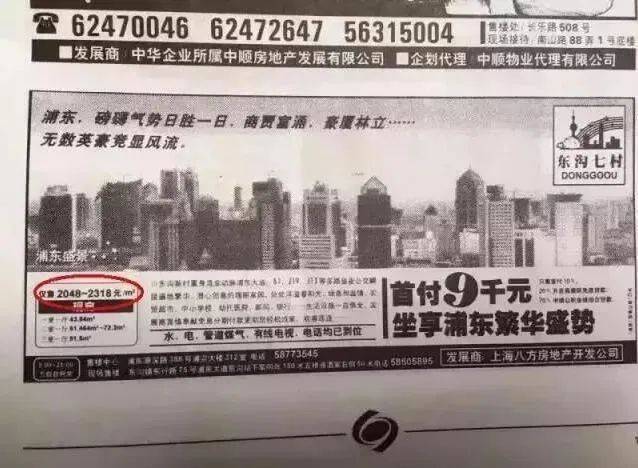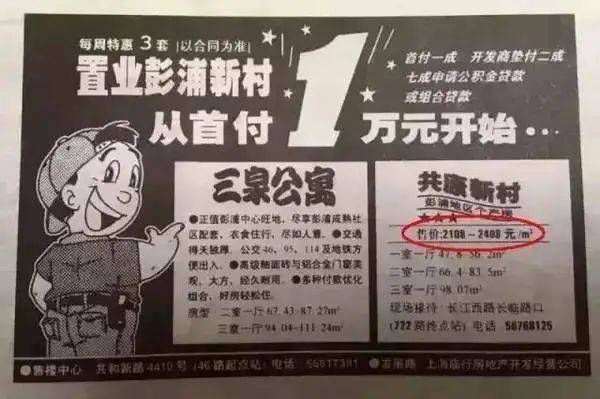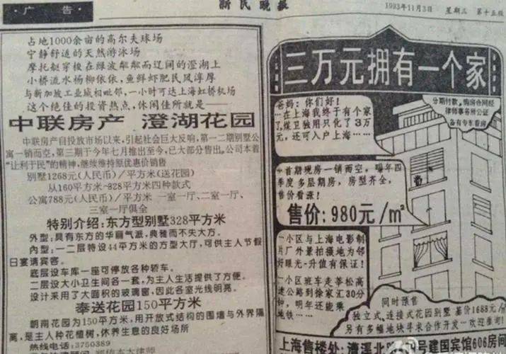 从一张1993年上海新民晚报的广告可以看出,一个位于漕溪北路的项目对外宣传的房价是980块钱一平米,“三万元拥有一个家”。