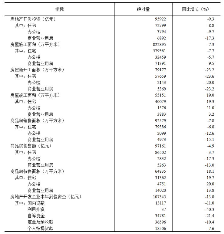 1—10月份,房地产开发企业房屋施工面积822895万平方米,同比下降7.3%。其中,住宅施工面积579361万平方米,下降7.7%。房屋新开工面积79177万平方米,下降23.2%。其中,住宅新开工面积57659万平方米,下降23.6%。房屋竣工面积55151万平方米,增长19.0%。其中,住宅竣工面积40079万平方米,增长19.3%。