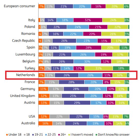 可以看出,大部分的荷兰人都是在19-25岁期间搬出来住的。大多数中国人在这个年龄,都是在上大学。
