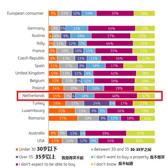40%的荷兰人表示自己买不了房。相比土耳其、西班牙等国人,悲观很多。