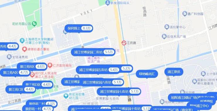 公开资料显示,地块的房地联动价为69000元/平,周边以低密度社区为主,包括了保利锦上、浦江坤庭等高端项目,挂牌价格在7-8万/平,而二手动迁房如世博家园挂牌均价仅5万/平出头。