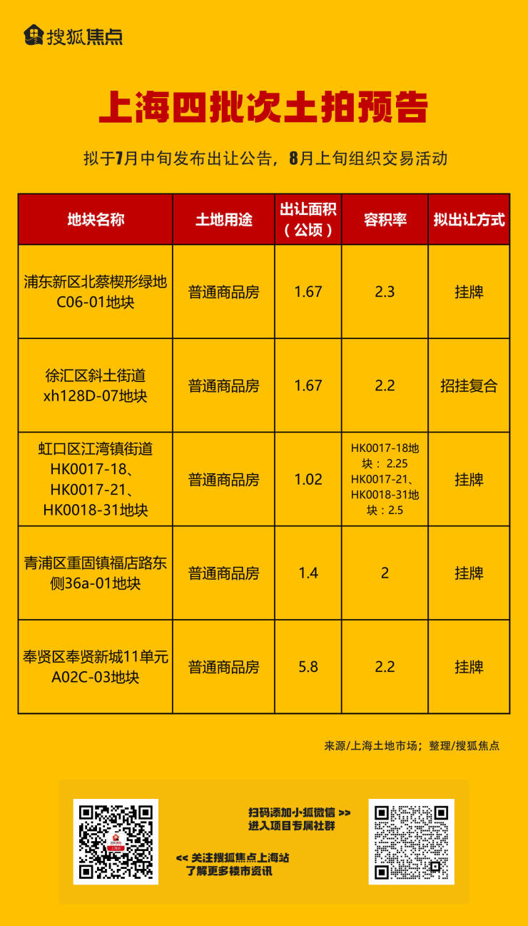 上海四批次土拍预告发布,5幅地块拟于8月上旬出让