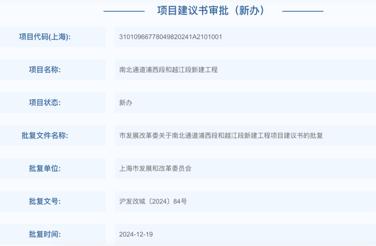 此次项目建议书获批也意味着南北通道浦西段和越江段新建工程即将进入立项阶段。