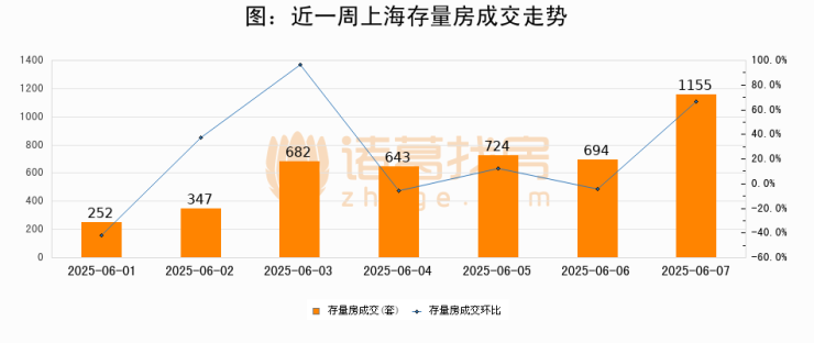 从存量房来看,2025年06月07日上海存量房单日成交1155套,比昨日增加461套,环比上涨66.4%。从近一周存量房成交来看,上海存量房日均成交套数为642套,06月07日单日成交1155套,高于近一周平均水平79.9%。