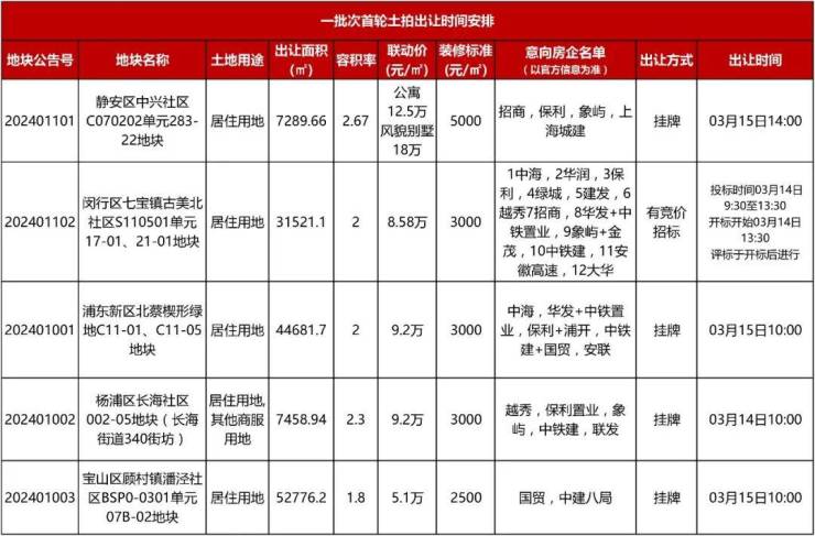 最新的意向房企名单及出让时间安排汇总如下: