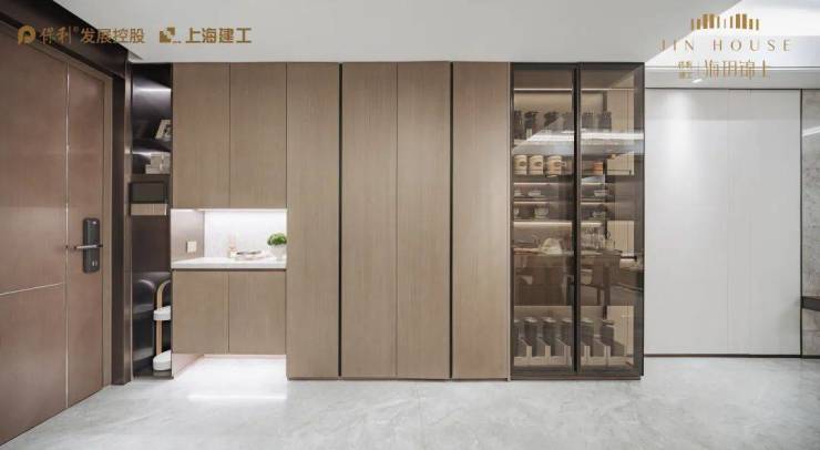 一入房门,左手边就是满满一排的玄关柜都是交付标准。收纳空间大,分割合理。出门常备的外衣和鞋子,亦或者是出远门要用的行李箱,都能井然有序地在此归类摆放。