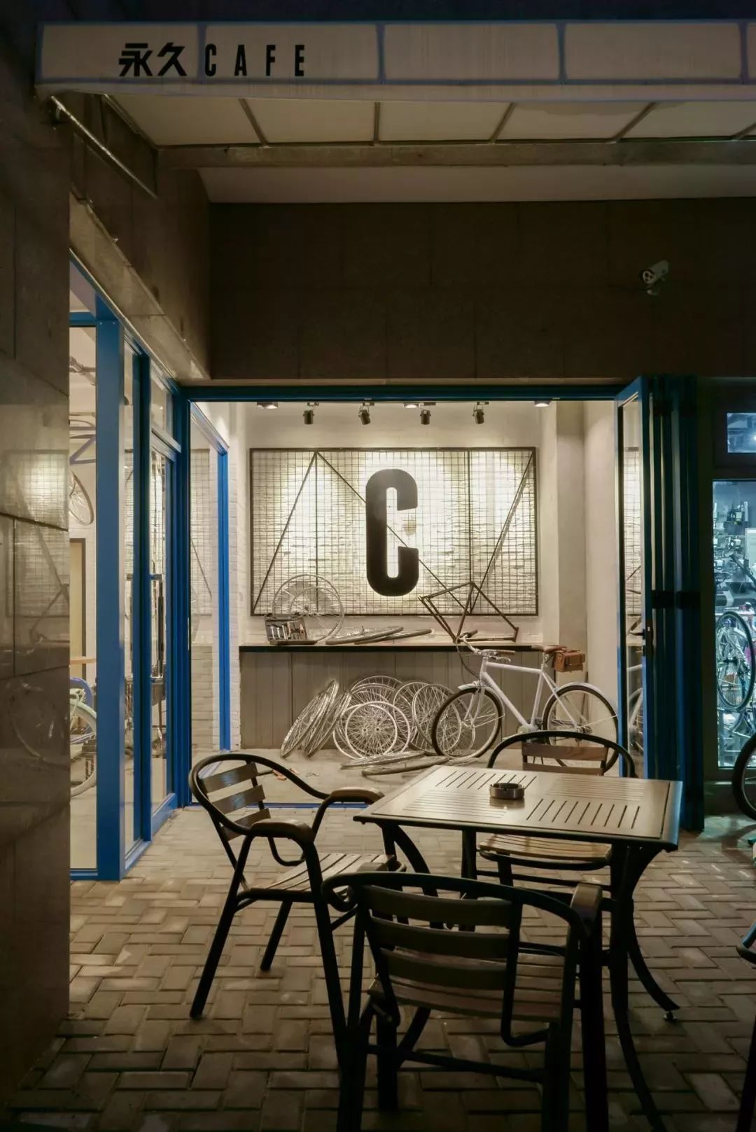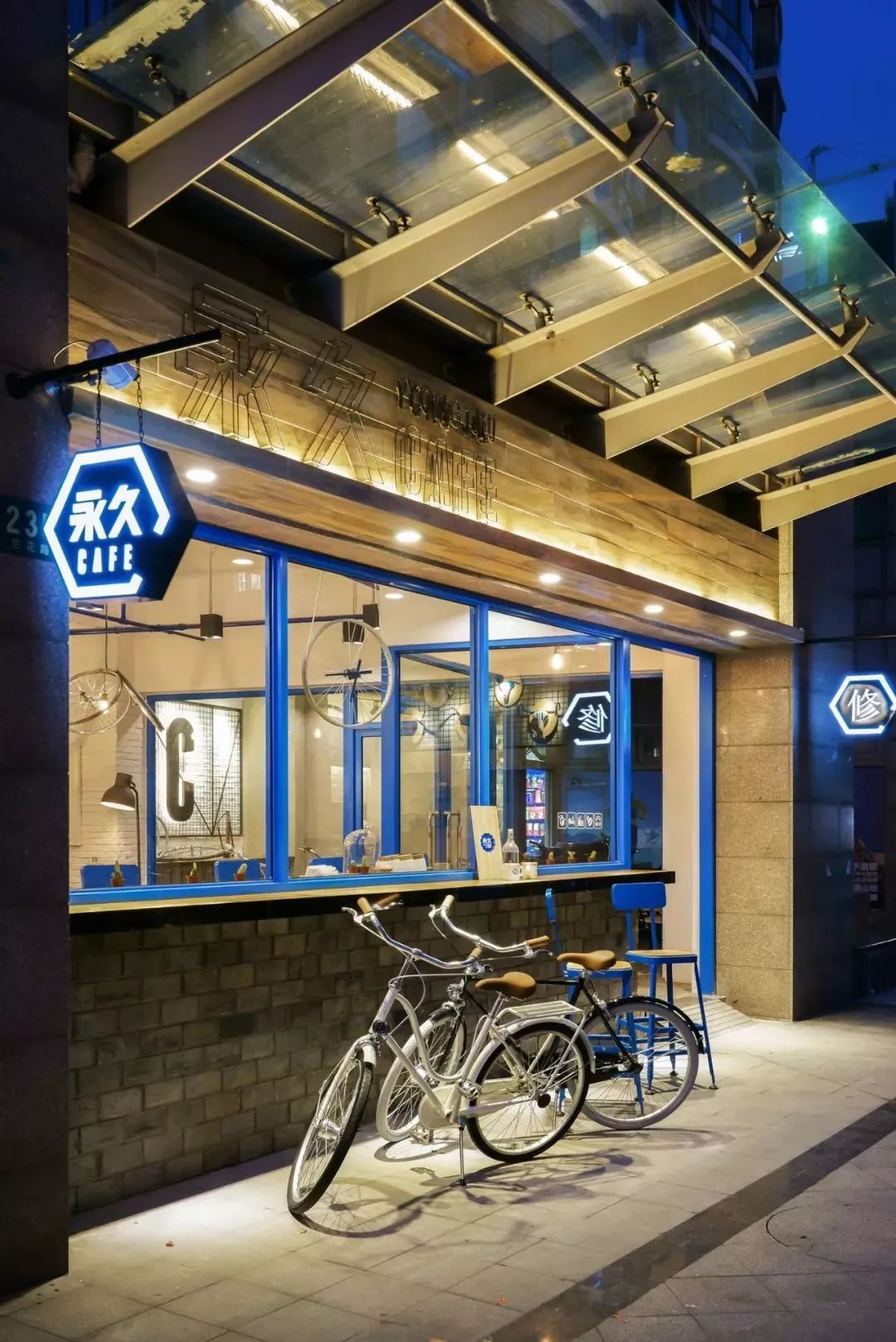 从商标取材的品牌蓝色,用到店面设计上,成为专属永久的店面形象。浅褐色原木“永久”店招,简约的设计,店门两旁的灯箱,除了展示品牌商标外,还有一个代表着修理站的「修」字灯箱,指引着客人到咖啡店旁的单车修理区。