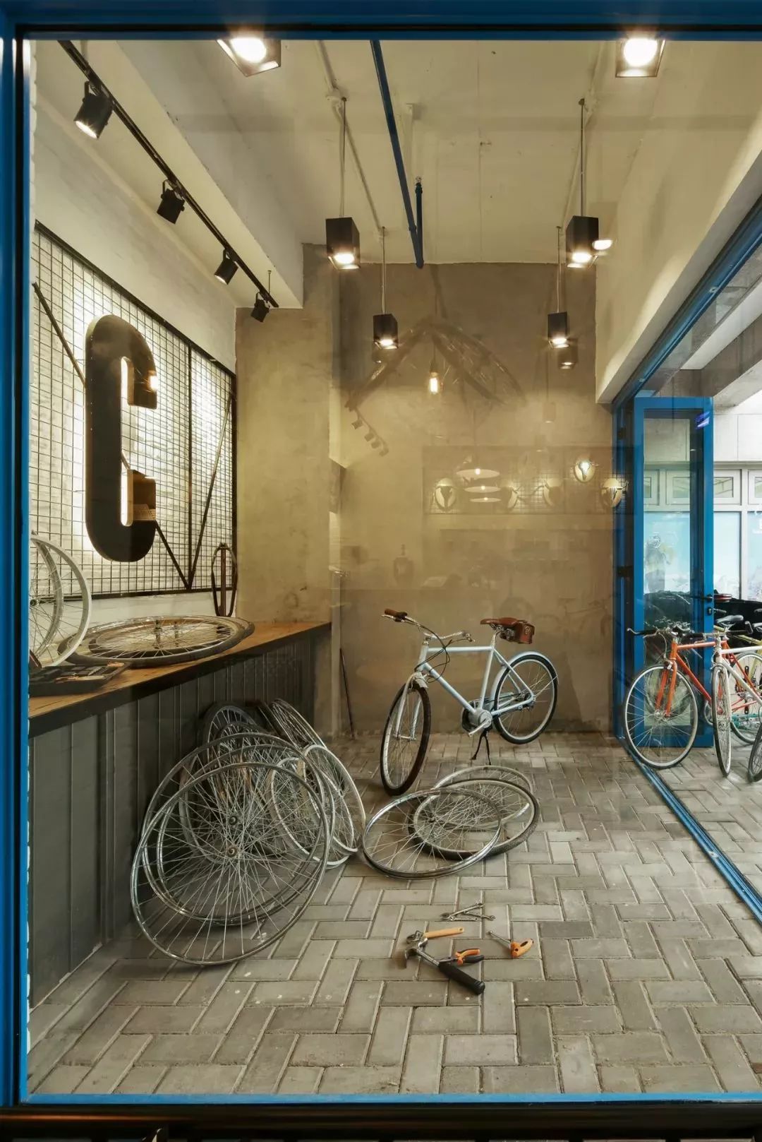 整个空间以工厂常见的铁架及铁网为店中的主调,并配合品牌的蓝色调,代表其悠久的历史。空间里不同位置自行车装置的加入,加强了人们对永久自行车的品牌印象。