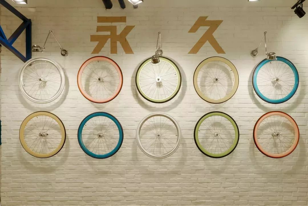 自行车既是空间展示的产品,更成为空间设计的细节元素。以自行车轮胎作为装饰元素,将不同颜色车轮突出显示在白色砖墙上,“永久”品牌突出地展示出来,富有新意。