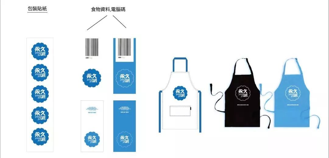 砖墙与地面、灯光色调与主体蓝色调的搭配,店内工作人员用品都配合空间主题做了设计。