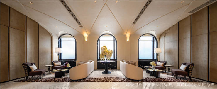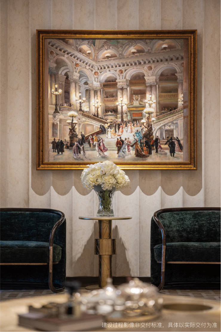 三层会客大厅延续「盛宴」的美学脉络,弧形沙发勾勒出舒展的社交动线,铜面茶几的曲面肌理漫反射着光影,墨绿绒质沙发与鎏金灯火相映,将旧时贵族气度与当代雅致生活完美相融。水晶柔光、绒布质感、编织肌理层层叠进,让海派的从容与法式的优雅成为空间里流动的气息,为塔尖人群打造出兼具仪式感与舒适度的社交主场。