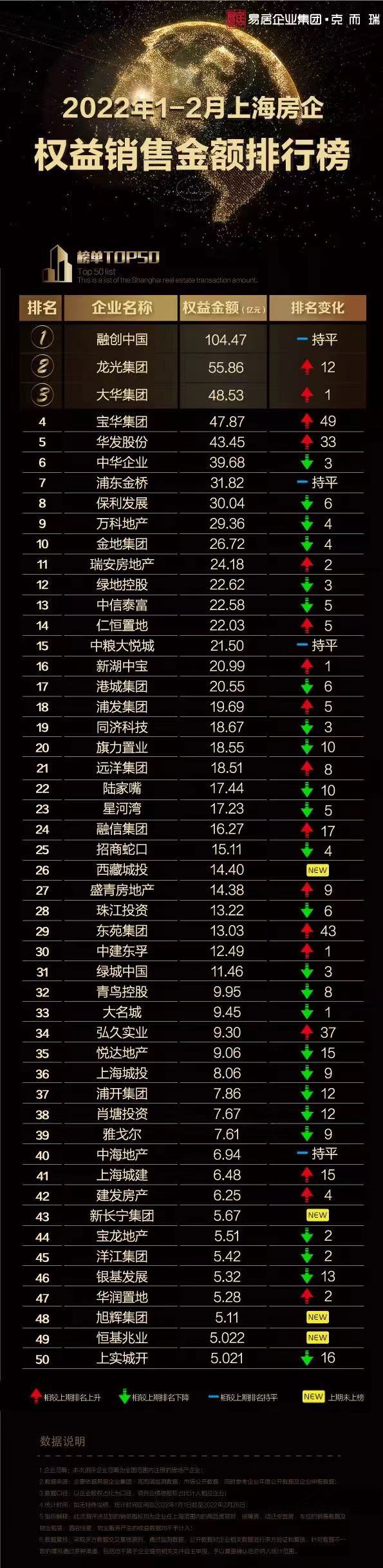 融创先进!2022年前2月房企上海区域权益销售TOP50出炉