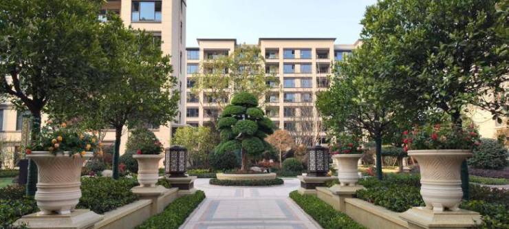 走进社区内部,可见一棵进口日本的罗汉松,如今正绽放着新的生机,其两侧种植了高杆香橼,展现一副气势磅礴的世家名邸画卷。