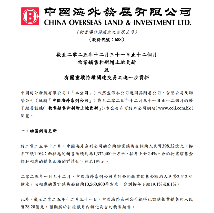 公告显示,2025年12月,中海集团实现合约物业销售金额约398.32亿元,同比微跌1.0%;销售面积约133.24万平方米,同比上升2.4%。