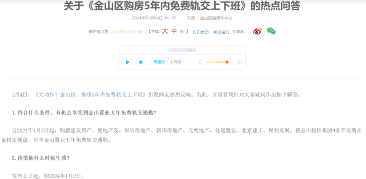 据金山区住房保障和房屋管理局本月初介绍,1月2日起,购置建发房产、复地产发、华纺房地产、新华房地产、光明地产、佳运置业、北京建工、保利发展、新金山投控集团9家开发商在金山指定楼盘,享受置业五年免费轨交通勤。