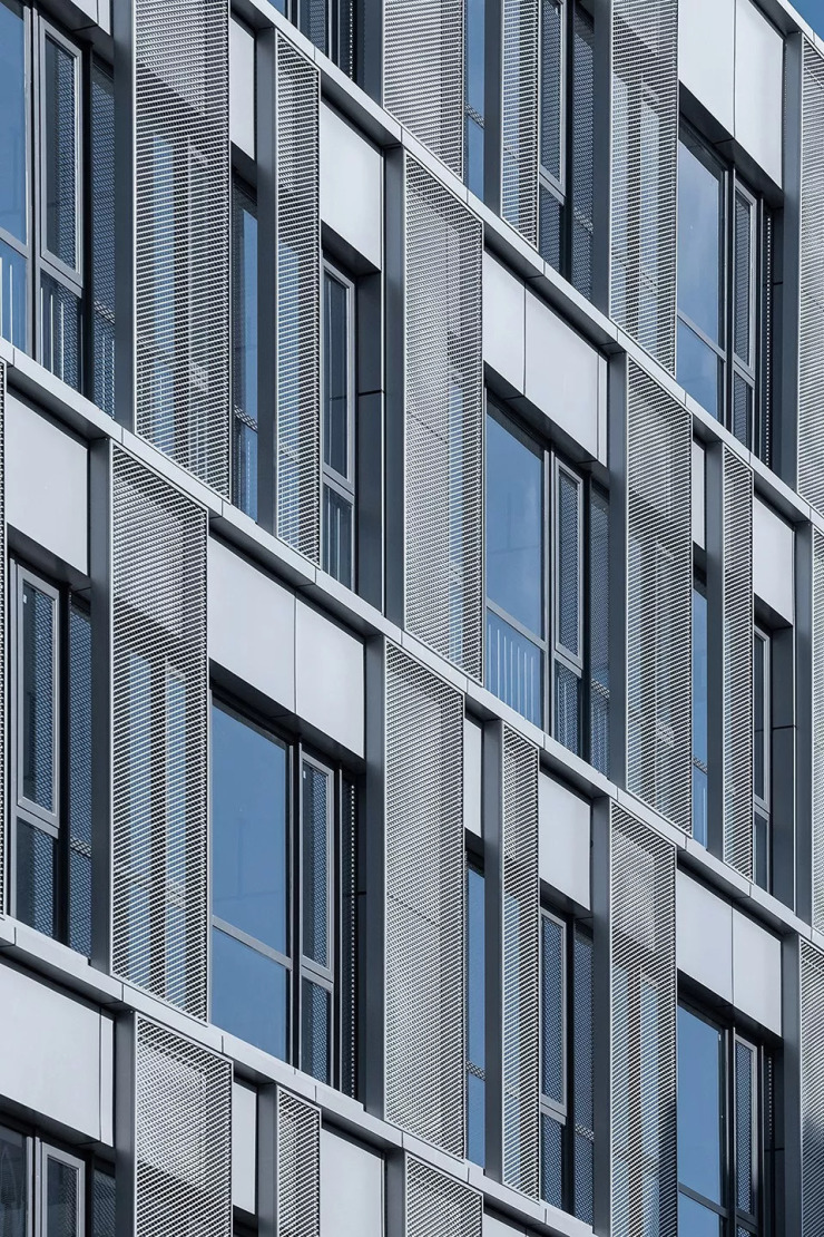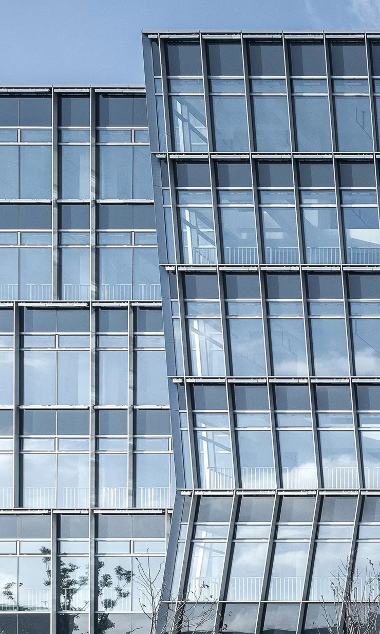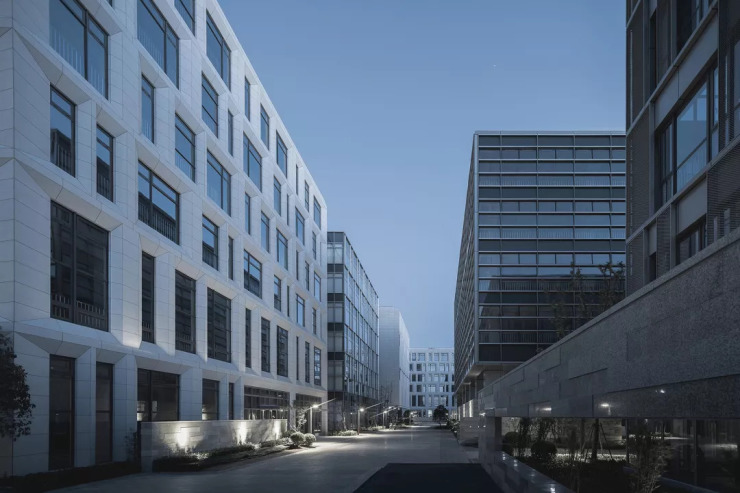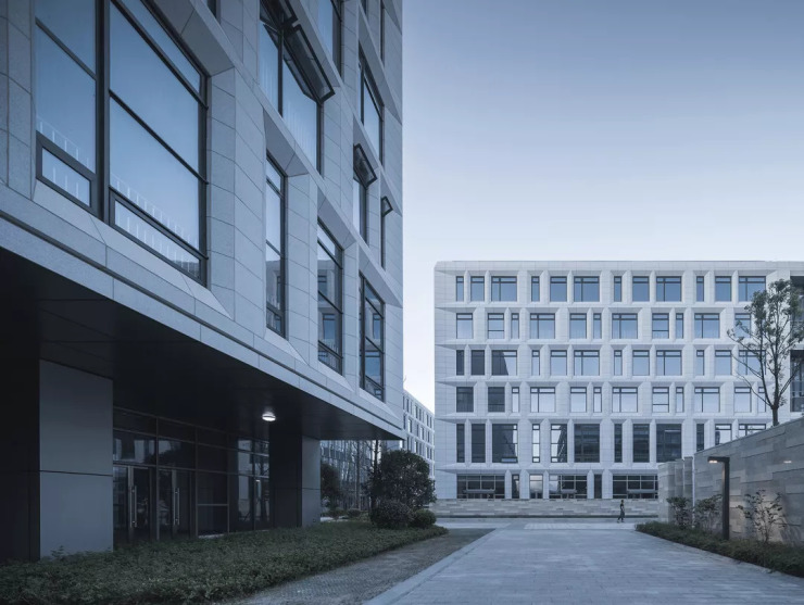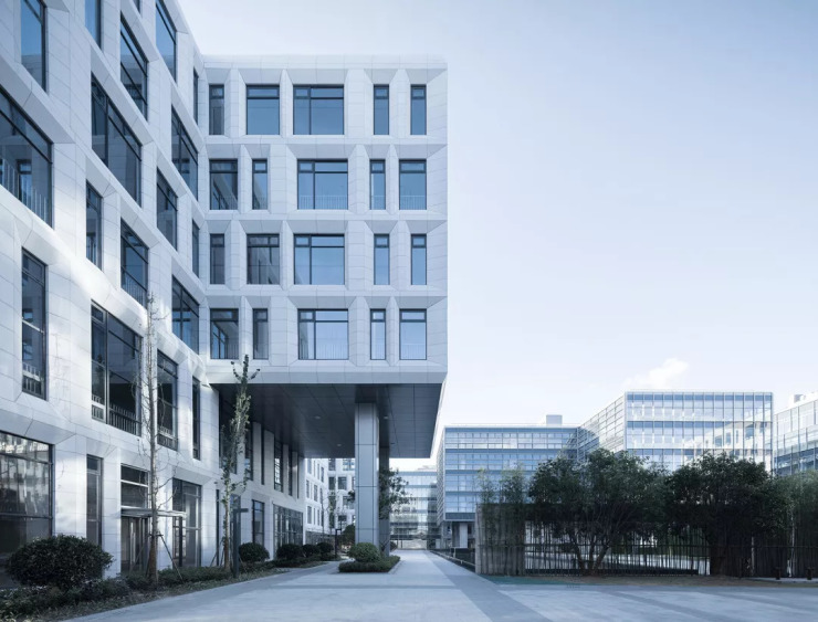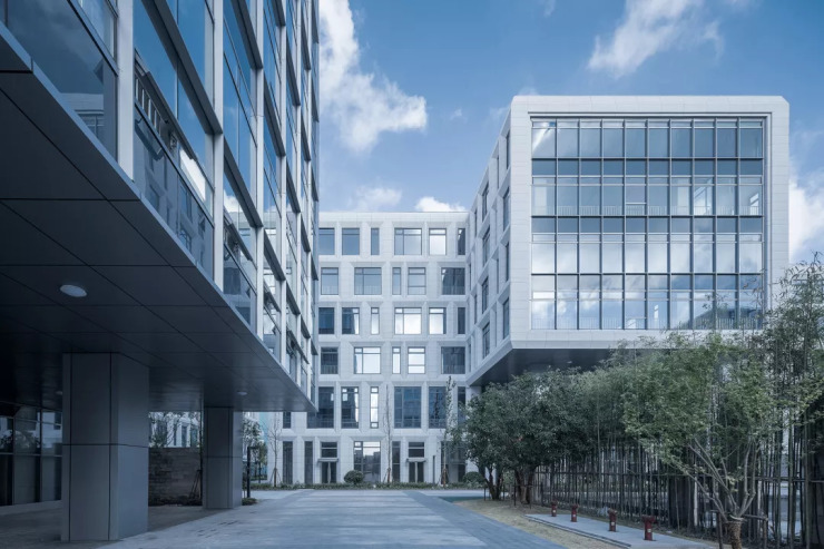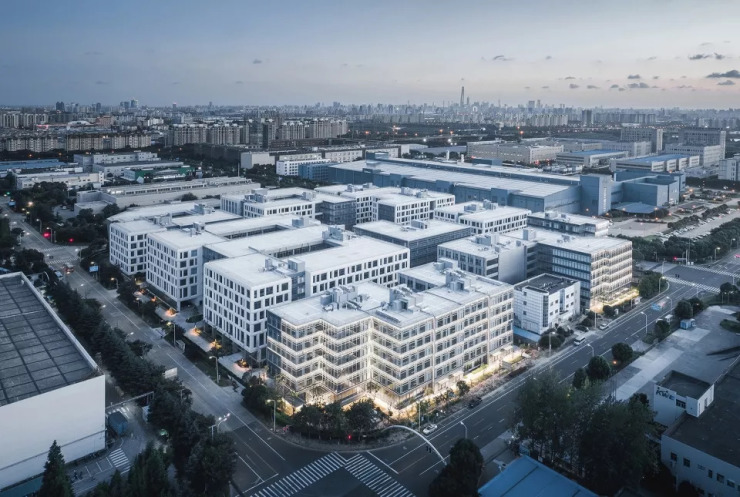 园区由10栋多层办公建筑组成。在满足项目高密度的前提下,设计团队通过塑造丰富的空间类型填补了外高桥自贸区内高端办公项目的缺失。