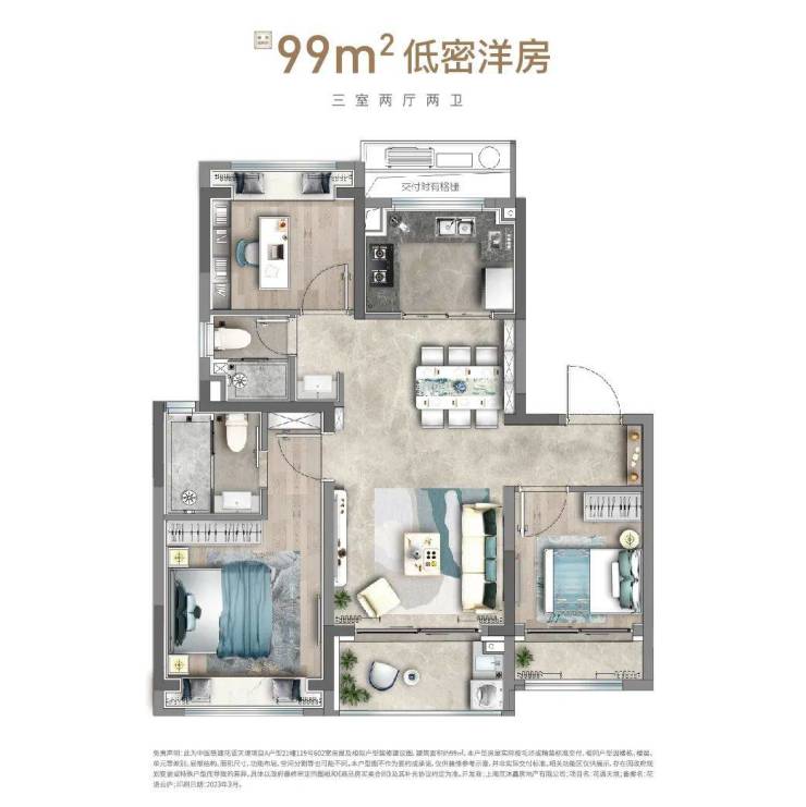 建筑面积约99㎡洋房一梯两户,三房两厅两卫飞机户型,三开间朝南,双阳台、双飘窗设计,采光更佳,餐客厅一体化设计联通景观阳台,主卧套房设计,私密性好,舒适性与实用性俱佳。满足三口之家到三世同堂的家庭居住需求。