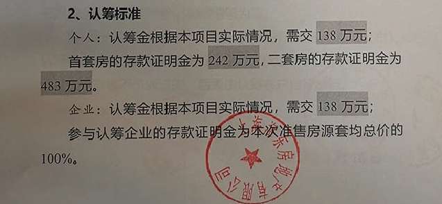 对于认筹标准,该项目认筹金额为138万元,首套房的存款证明金为242万元,二套房存款证明金为483万元。