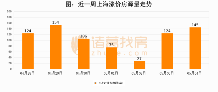 根据诸葛找房数据显示,上海24小时涨价房源量为145套,较05月03日增加21套,环比上涨16.9%。与此同时,涨价房源占比小幅扩大,业主信心有所提升。
