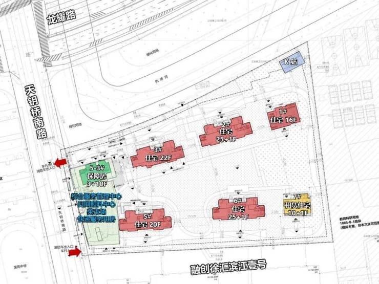 根据公示,项目将拟建7幢最高为26层的高层,其中位于地块西北角的5-3#楼为保障房,而东南角的7#楼为租赁住宅,其余5幢高层均为可售住宅,项目总户数为474户(含租赁和保障房),其中454套为中小套户型。地块高层住宅之间,南北向楼间距最小为30.38米,最大为48.28米。未来在项目西侧的天钥桥南路设置主要出入口。