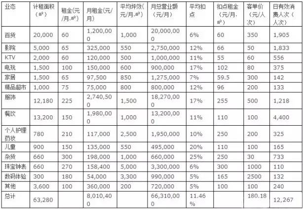 各业态平均营业坪效参考╳╳成熟商业项目平均水平;