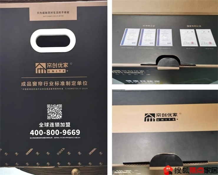 包装箱内部帘创优家的“3C体系认证”及“国家专利认证”,以及包装外部的设计,无一不体现出帘创优家包装箱的精致及用心设计。