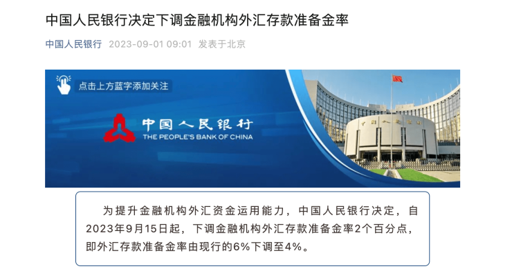自2023年9月15日起,下调金融机构外汇存款准备金率2个百分点,即外汇存款准备金率由现行的6%下调至4%。