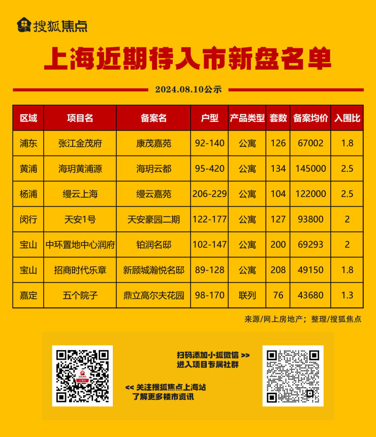 8月10日,网上房地产网站公示了《本市近期将上市新建商品住房项目一览表》,共7个项目,共975套房源。项目分别为张江金茂府、海玥黄浦源、缦云上海、天安1号、中环置地中心润府、招商时代乐章、五个院子。