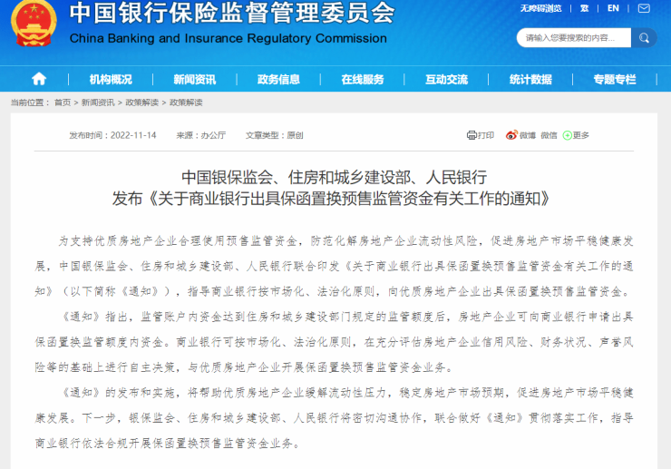 中国银保监会、住房和城乡建设部、中国人民银行11月14日发布《关于商业银行出具保函置换预售监管资金有关工作的通知》,明确商业银行出具保函置换预售监管资金相关要求,支持优质房地产企业合理使用预售监管资金,防范化解房地产企业流动性风险,促进房地产市场平稳健康发展。有关事项通知如下: