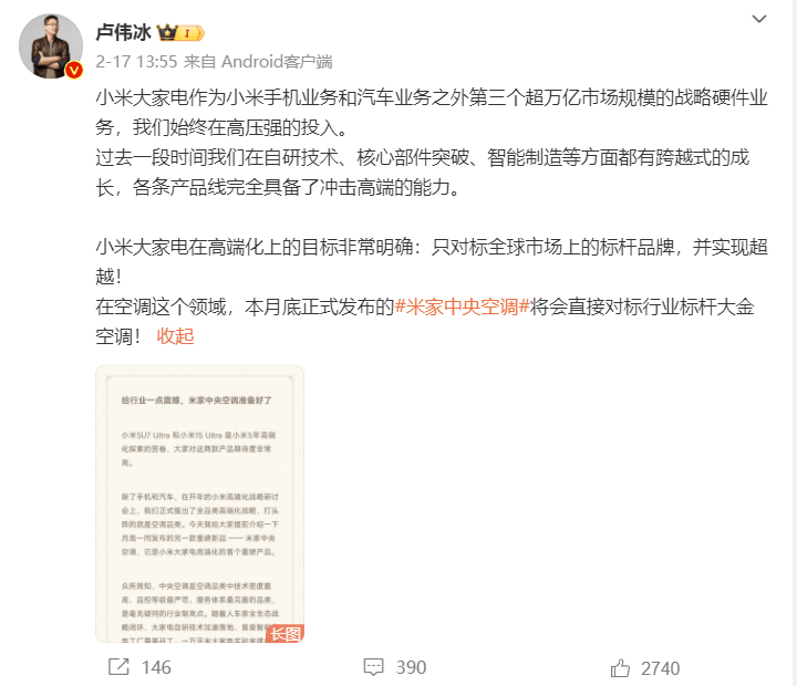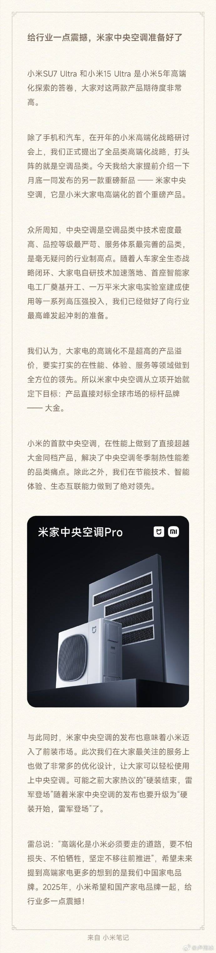 2 月 17 日,小米集团总裁卢伟冰通过个人微博正式宣布,小米计划于本月底推出米家中央空调,该产品明确对标行业内的领军品牌大金空调。这一举动不仅是小米在高端家电领域的关键布局,更是其全面推进全品类高端化战略的重要里程碑。