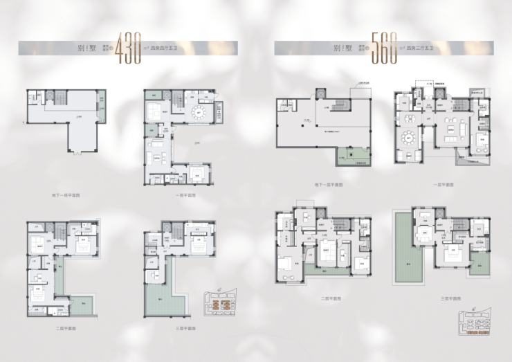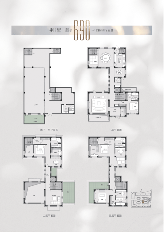 1号楼为保障房,2、3、4、8#为洋房平层,5、6、7、9、10#为别墅。洋房建面约170-340㎡,别墅建面约430-690㎡。