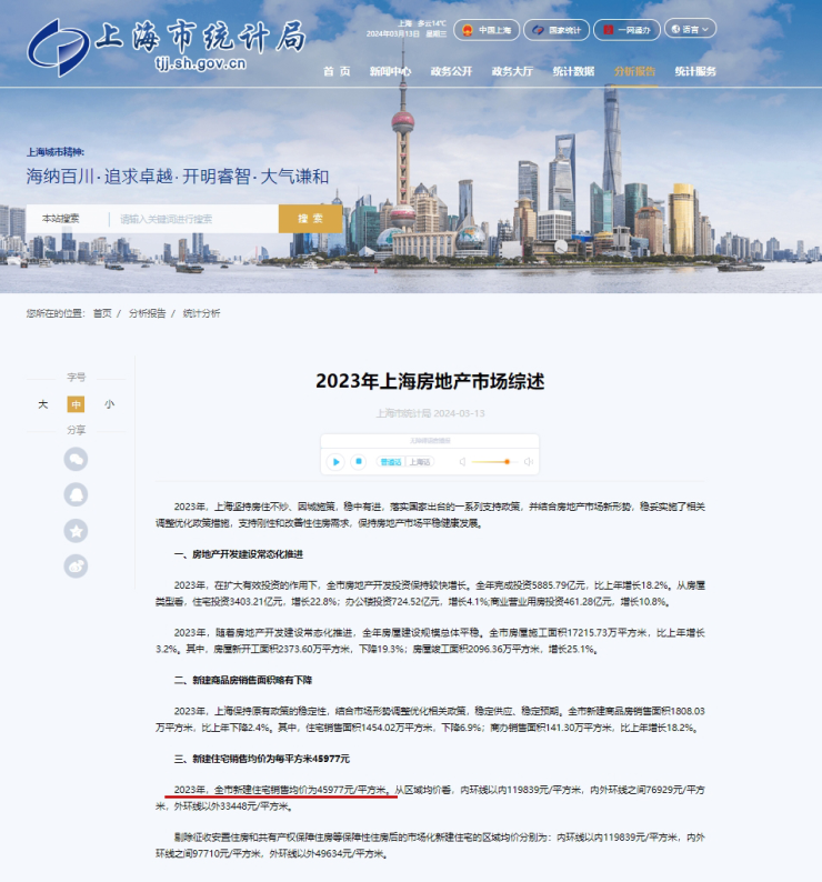 上海每年的个人住房房产税税率分界线,是根据上年度新房销售均价的2倍来计算,上海市统计局已经公布了2023年的新建住宅销售均价,为45977元/㎡。较2022年均价44430元/㎡上涨了约3.48%。