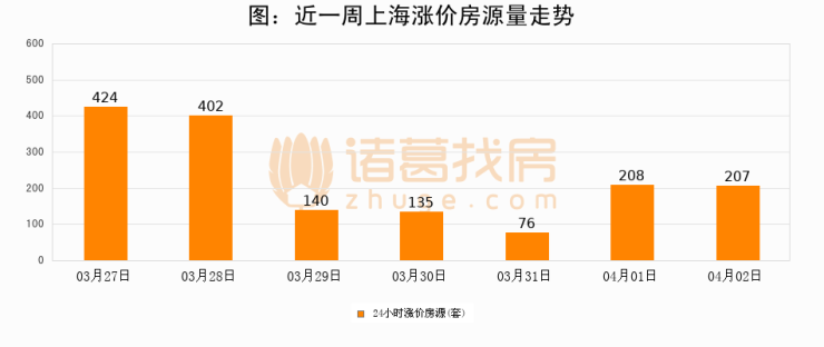 根据诸葛找房数据显示,上海24小时涨价房源量为207套,较04月01日减少1套,环比下降0.5%。与此同时,涨价房源占比小幅回落,对于购房者来说是一个入市窗口期,购房者可抓住时机入市。