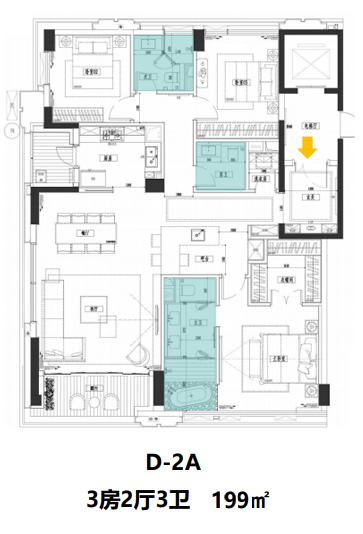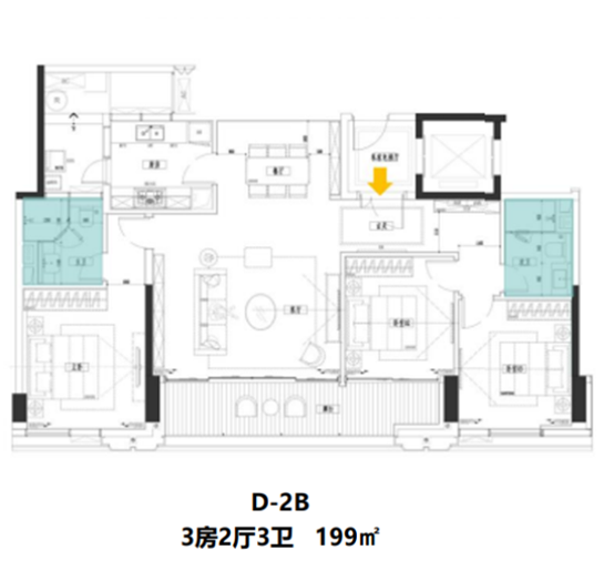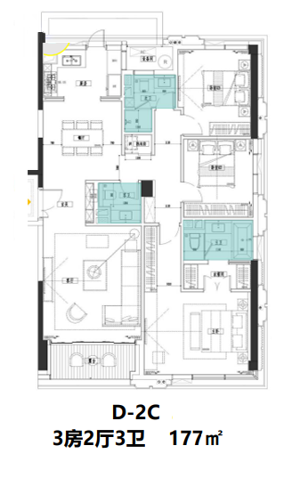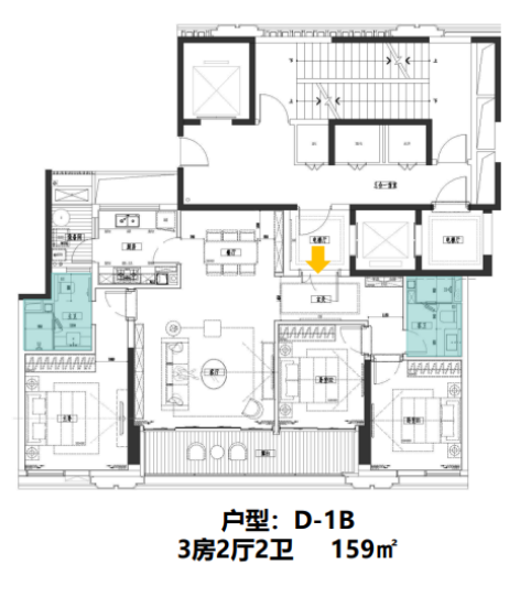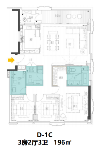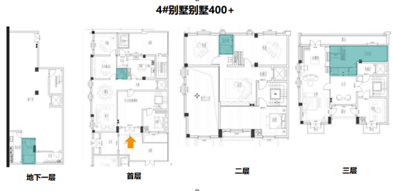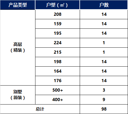 D1地块为精装高层+精装别墅,高层主力户型为建面约159-208㎡3房,别墅主力户型为建面约400+、500+㎡5房。其中高层86套,别墅12套。