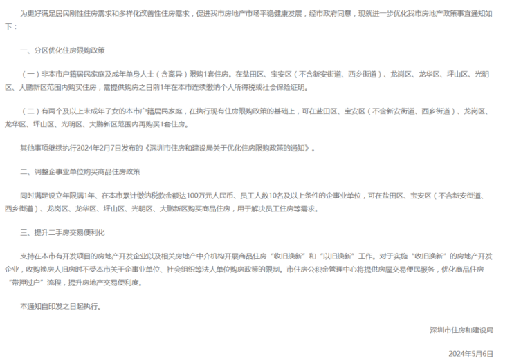 5月6日,小长假结束后首个工作日,深圳住建局便发布了楼市松绑大礼包--分区优化住房限购政策、调整企事业单位购买商品住房政策。