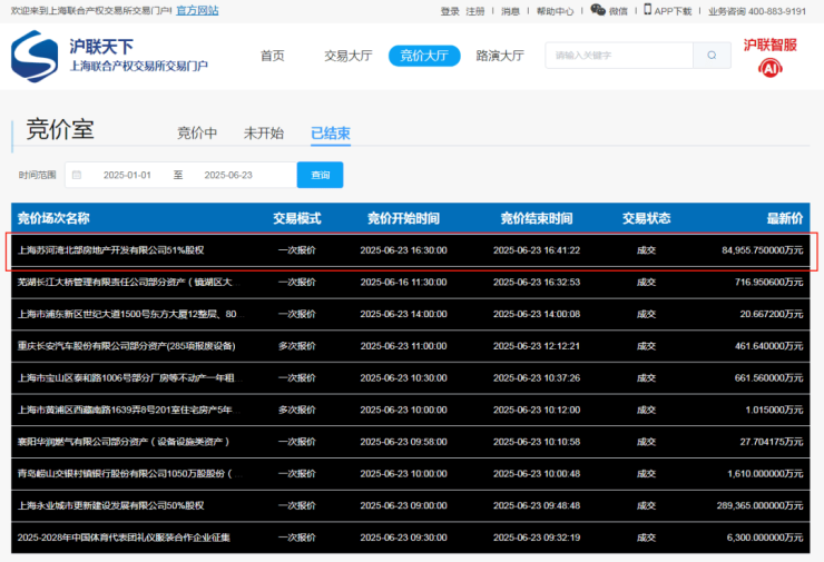 5月26日,上海苏河湾北部房地产开发有限公司51%股权挂牌转让,转让底价8.50亿元,转让方为上海苏河湾(集团)有限公司,标的公司上海苏河湾北部房地产开发有限公司成立于2023年2月9日,由上海苏河湾(集团)有限公司100%控股。转让方上海苏河湾(集团)有限公司成立于2010年7月6日,由上海市静安区国有资产监督管理委员会(上海市静安区集体资产监督管理委员会)持股100%。