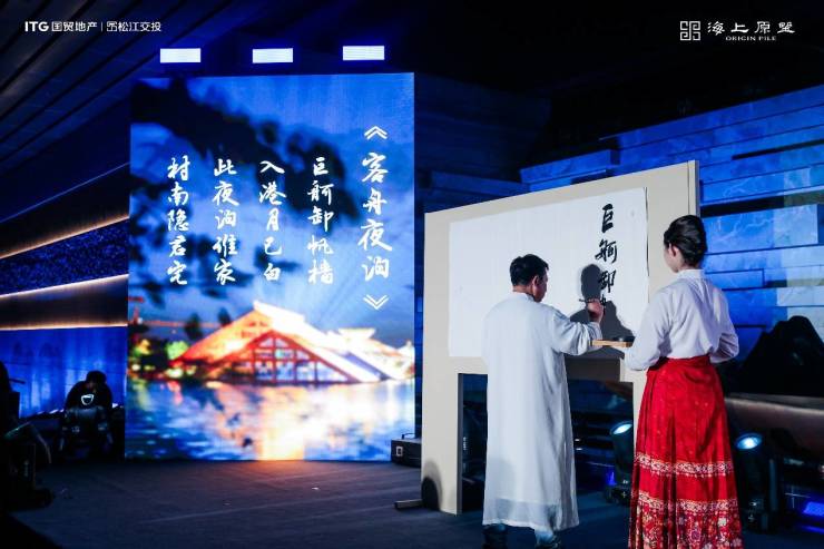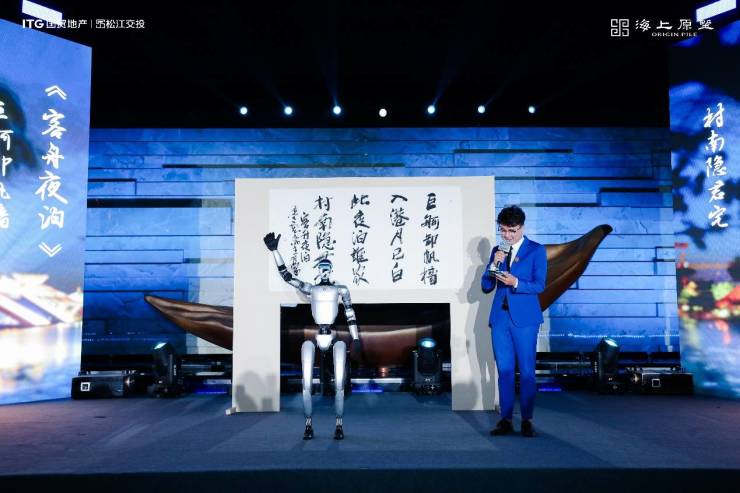示范区开放现场,最有趣的场景当属松江书法家与AI机器人联袂创作《客舟夜泊》。宣纸上的墨韵与AI机器人的创意,开启文化与科技的创新对话,这也印证了海上原墅将这种“科技人文”思维注入了居住场景。