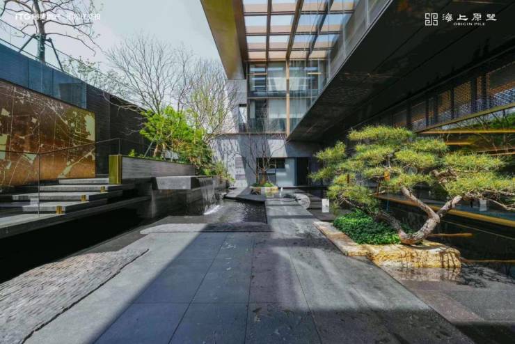 步入内庭,横浦归帆铺陈眼前。江南涟漪、落日金辉的交相辉映。三株珍稀黑松傲然矗立,以舒展姿态尊贵致礼;“村庄雨霁”归家步道云雾缭绕,步履成诗,让人流连忘返。